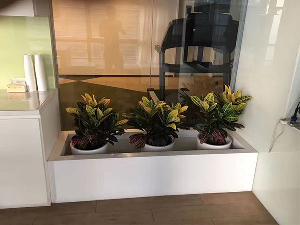 前臺是一家中心的門面,所以擺放的植物要求具一定的檔次??梢赃x擇在前臺側邊位置擺放一些枝葉比較茂盛的品種,寓意中心蓬勃生機。中心臺面可以選擇擺放一盆紅掌、粉掌或蝴蝶蘭盆栽,這幾類植物都是時令花卉,鮮花比較醒目給人感覺比較紅火。